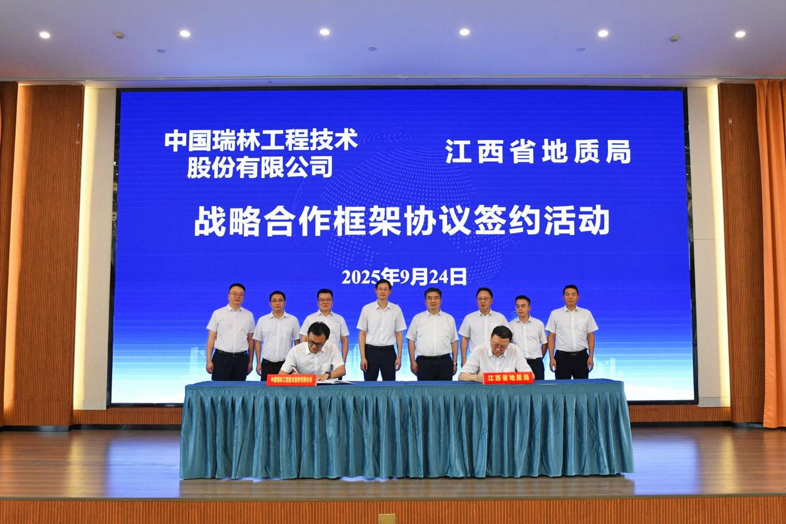 9月24日,中國瑞林工程技術股份有限公司(以下簡稱“中國瑞林”)與江西省地質局(以下簡稱“省地質局”)簽訂戰略合作框架協議。中國瑞林黨委書記、總經理吳潤華,省自然資源廳黨組成員、省地質局黨組書記饒清華出席儀式并致辭,中國瑞林黨委委員、副總經理劉奕與省地質局黨組成員、副局長吳俊華代表雙方簽約。